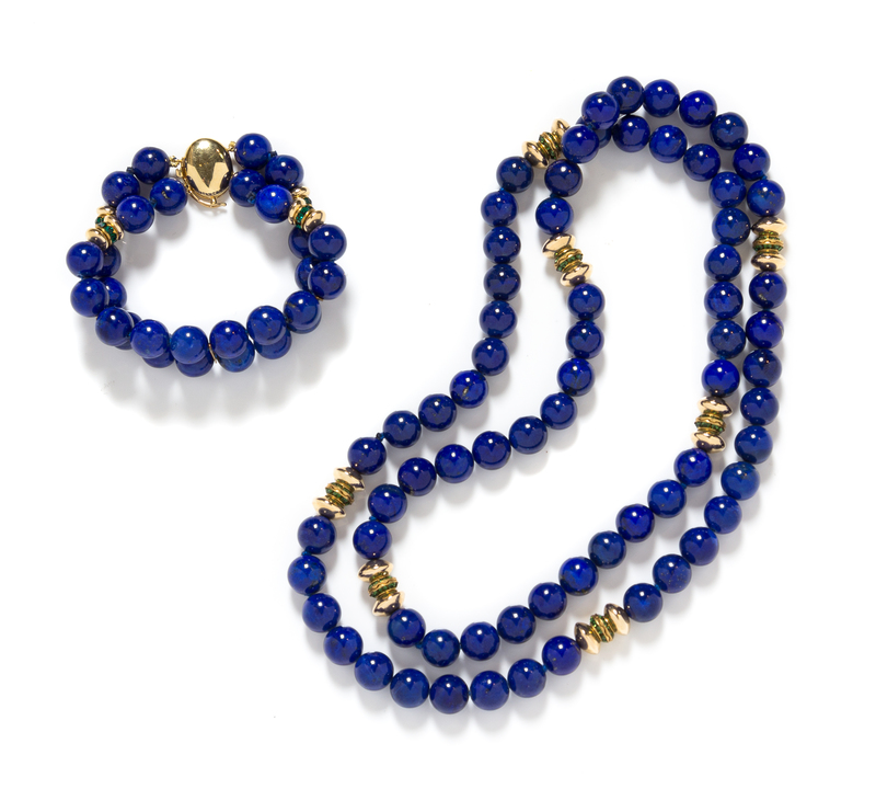 consisting of a necklace containing 71 lapis lazuli beads measuring approximately 10.17 mm in diameter, 22 gold beads, and 11 gold tone and green rhinestone spacer beads strung with a 14 karat yellow gold clasp together with a matching double row bracelet containing 28 lapis lazuli beads measuring approximately 9.95 mm in diameter, eight gold beads and four gold tone and green rhinestone spacer beads strung with a 14 karat yellow gold clasp.