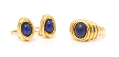 consisting of a pair of 18 karat yellow gold earclips containing two oval cabochon cut lapis lazuli measuring approximately 8.00 x 6.18 mm together with a yellow gold ring containing one oval cabochon cut lapis lazuli measuring approximately 9.11 x 7.30 mm.Earrings stamp: 18K (maker's mark).Ring stamp: K.