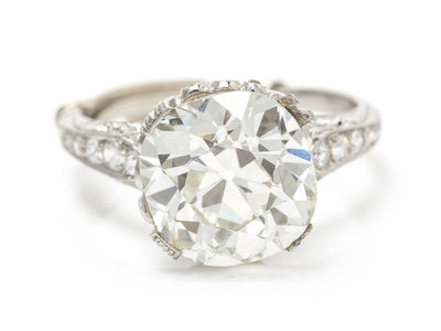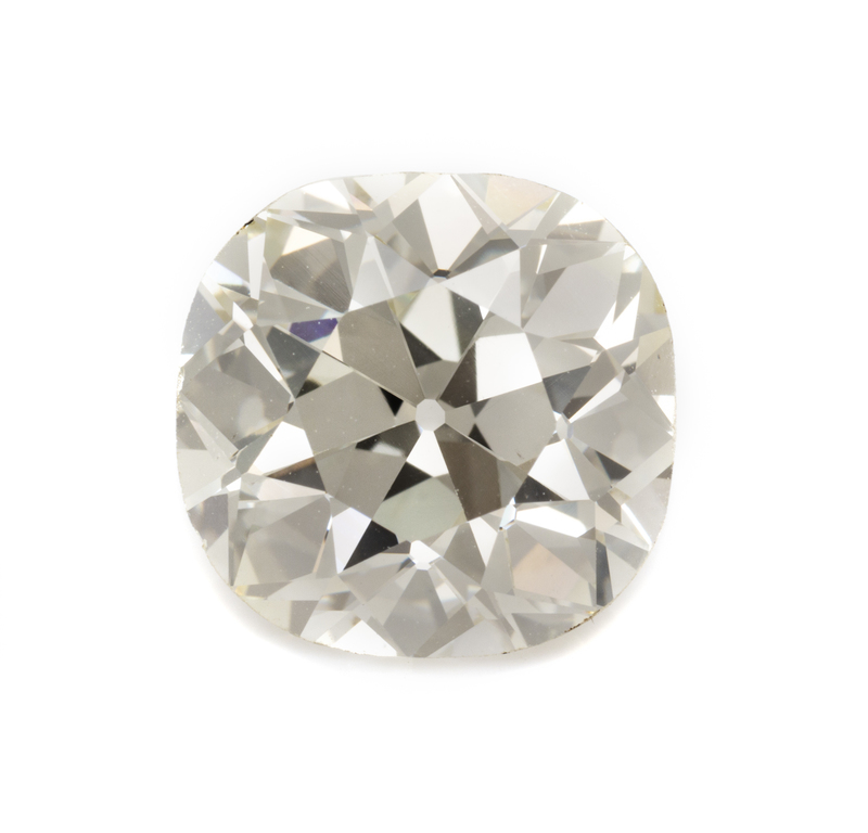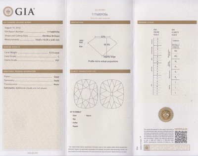 containing one old mine cut diamond weighing approximately 5.13 carats and numerous round single cut diamonds weighing approximately 0.46 carat total.Accompanied by a Gemological Institute of America diamond grading certificate number 1176809356, dated August 15, 2016, stating Color: L, Clarity: VS1, Table: 53.00%, Depth: 65.90%, Polish: Good, Symmetry: Good, Fluorescence: None.