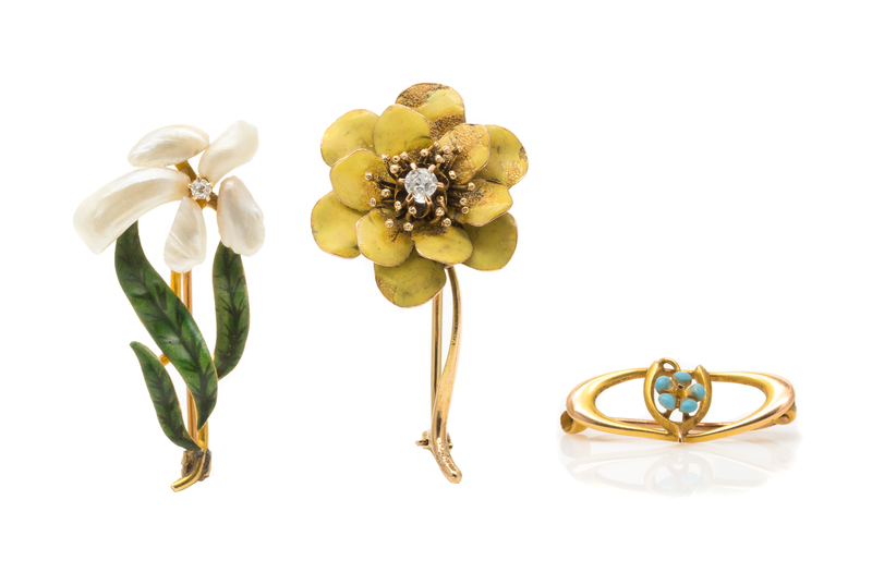 consisting of a flower brooch containing five baroque pearls, one old European cut diamond weighing approximately 0.03 carat and three green enamel leaves, a yellow gold brooch containing one old European cut diamond weighing approximately 0.10 carat and numerous yellow enameled petals together with a 10 karat gold brooch containing horseshoe and flower motif.