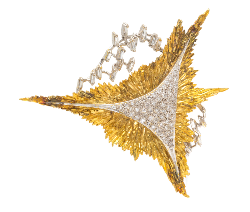 in an abstract design composed of a triangular textured yellow gold base surmounted and surrounded by white gold accents containing 60 round single cut diamonds weighing approximately 0.55 carat total and 22 baguette cut diamonds weighing approximately 0.66 carat total.Stamp: 18K.