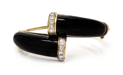 A 14 Karat Yellow Gold, Onyx and Diamond Bangle,