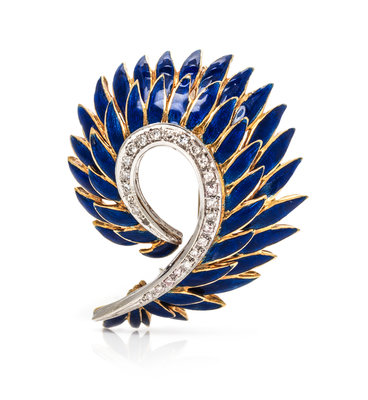 containing 25 round single cut diamonds weighing approximately 0.20 carat and blue enamel in a swirling feather motif.Stamp: M 18K ITALY.