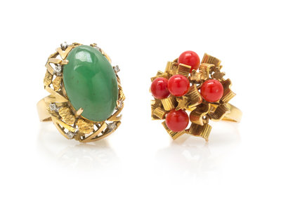 consisting of a 10 karat yellow gold ring containing one oval cabochon cut jadeite jade measuring approximately 20.30 x 13.70 mm and eight round single cut diamonds weighing approximately 0.12 carat total, together with a 14 karat yellow gold ring containing five round coral beads (origin of color not tested) measuring approximately 5.60-5.80 mm in diameter.Stamp: 10K.Stamp: 14K.