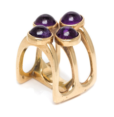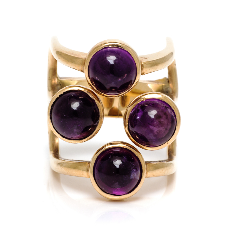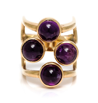 containing four round cabochon cut amethyst measuring approximately 7.10-7.50 mm in diameter.Stamp: 14K.