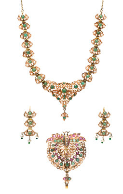consisting of a 14 karat gold necklace containing round cabochon and mixed cut emeralds measuring approximately 2.30-5.00 mm in diameter and numerous seed pearls, a pair of matching earrings containing six round cabochon cut emeralds, six emerald beads and numerous seed pearls, together with peacock motif pendant/brooch containing round cabochon and mixed cut emeralds, numerous round cabochon and mixed cut rubies and numerous seed pearls.Necklace stamp: 14K.