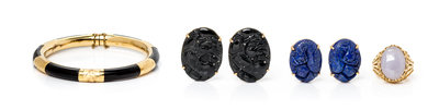 consisting of a pair of earclips containing two oval carved lapis lazuli plaques, a pair of earclips containing two oval carved onyx plaques, a ringcontaining one oval cabochon cut lavender jade together with a bangle containing six curved carved onyx segments.Earclip stamp: 14K MK.Earclip stamp: 14K MK.Ring stamp: 14K EP.Bangle stamp: 585 14K.
