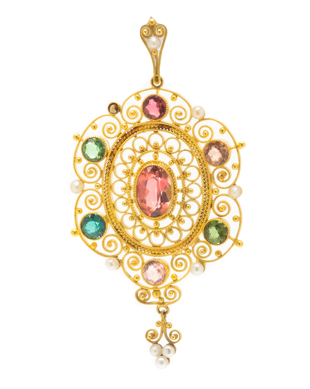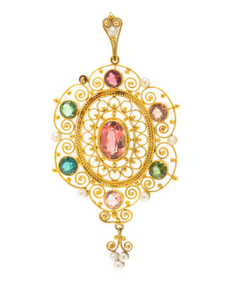 containing one oval mixed cut pink tourmaline measuring approximately 8.48 x 6.22 mm, six round mixed cut tourmalines in various shades of pink and green and nine seed pearls measuring approximately 2.17 mm in diameter in an openwork setting with wirework and cannetille designs.Stamp: 18 KT (partially obscured).