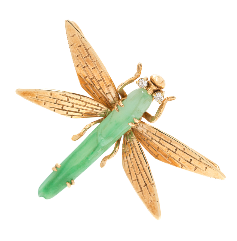 A 14 Karat Yellow Gold, Jade and Diamond Dragonfly Pendant/ Brooch,