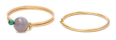 consisting of two bangles suspending a chalcedony and aventurine bead pendant, together with a bangle bracelet.Stamp: 750 (obscured).