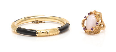 consisting of a bangle containing four curved onyx sections set into a yellow gold setting with foliate motif engravings together with a ring containing one oval cabochon cut white jadeite jade measuring approximately 19.70 x 14.50 mm and five round mixed cut amethysts measuring approximately 3.00 mm each. Bangle stamp: 14K 585.Ring stamp: 14K.