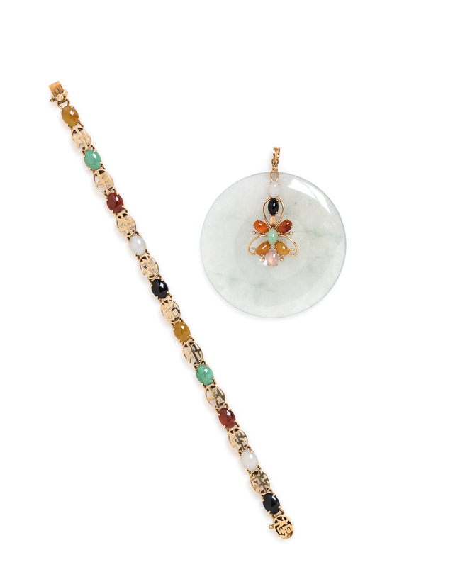 consisting of a pendant containing a jade bi measuring approximately 54.00 mm in diameter, the center surmounted with eight oval cabochon cut multi-colored jadeite jade stones measuring approximately 6.00 x 4.20 mm, together with a bracelet containing 10 oval cabochon cut multi-colored jadeite jade measuring approximately 8.00 x 6.00 mm.Pendant stamp: REC 14K.Bracelet stamp: 14Kt.