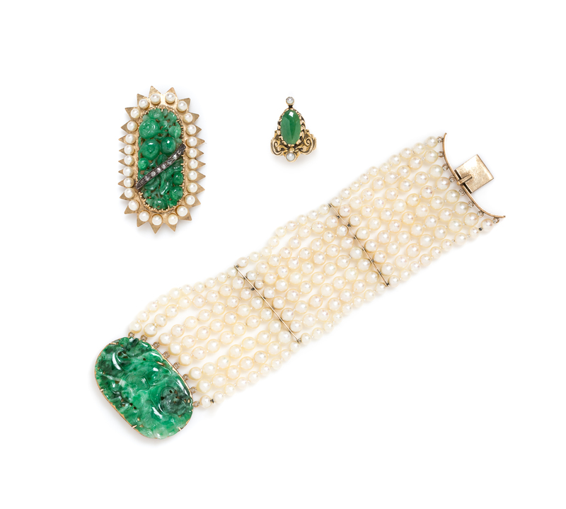 consisting of a multistrand pearl bracelet containing numerous pearls measuring approximately 4.73-5.90 mm in diameter strung knotted with two gold spacer bars and an oval gold clasp containing a carved and pierced jade plaque, a yellow gold brooch containing a carved and pierced jade plaque measuring approximately 41.00 x 19.00 mm surmounted with a row of rose cuts diamonds set in silver, with a serrated edge and a surround of numerous pearls measuring approximately 4.40-4.62 mm in diameter, together with a yellow gold ring in an Art Nouveau style, containing one oval cabochon cut jadeite jade measuring approximately 14.85 x 8.60 mm and two split pearls measuring approximately 3.00-3.44 mm in diameter.