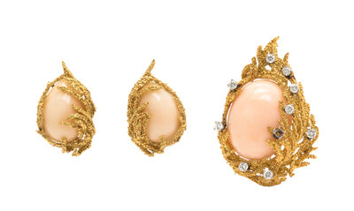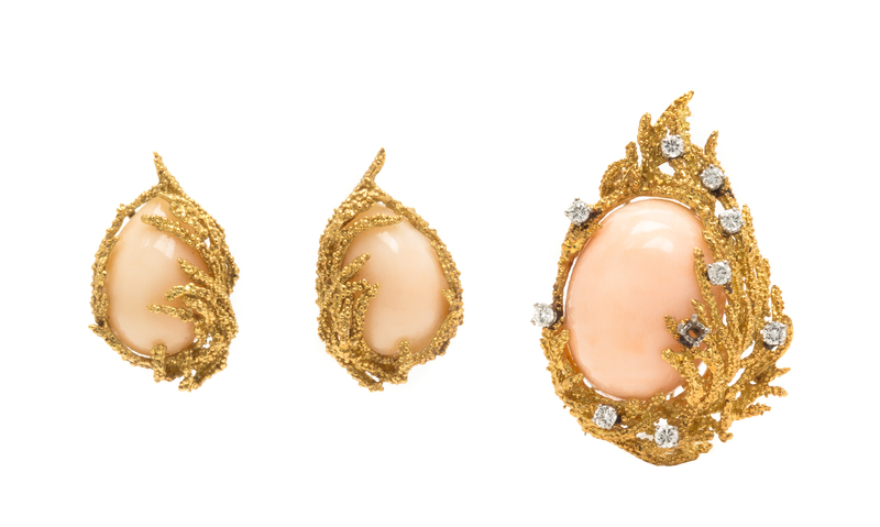 An 18 Karat Yellow Gold, Angelskin Coral and Diamond Demi Parure,