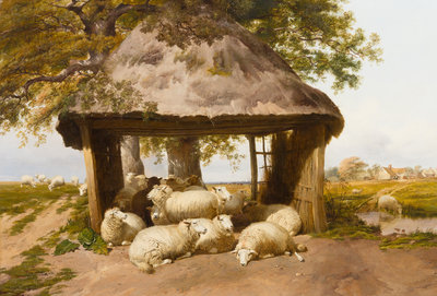 A Flock of Sheep Sheltering in a Pasture