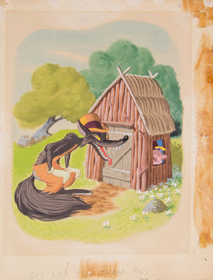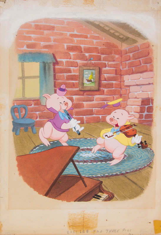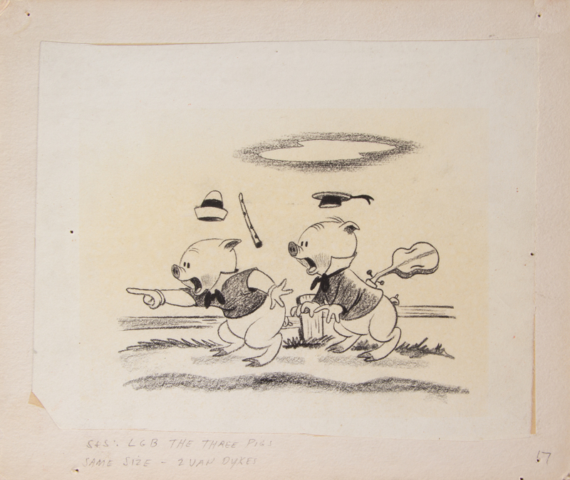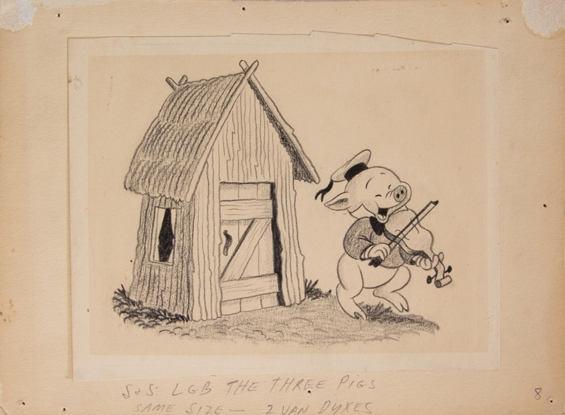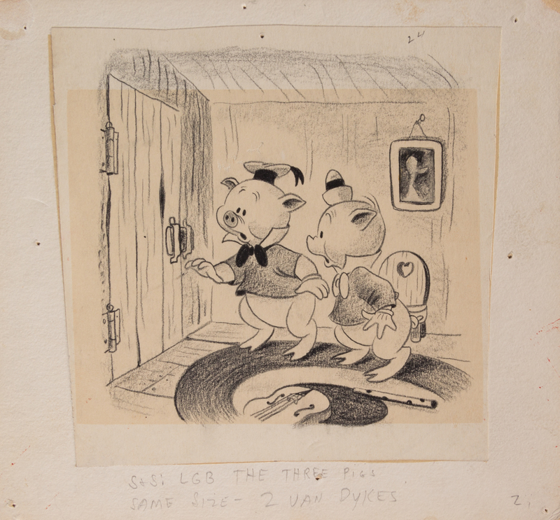 of The Three Little Pigs, comprising three black and white pencil sketches and two colored boards.