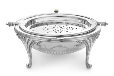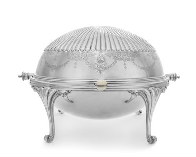 of ovoid form, the swiveling top with reeded decoration above foliate swags and volutes, raised on scroll feet.