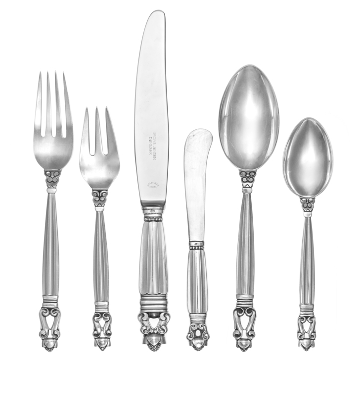 Acorn pattern, comprising:12 dinner knives12 dinner forks12 salad forks12 butter knives14 dinner spoons24 teaspoons
