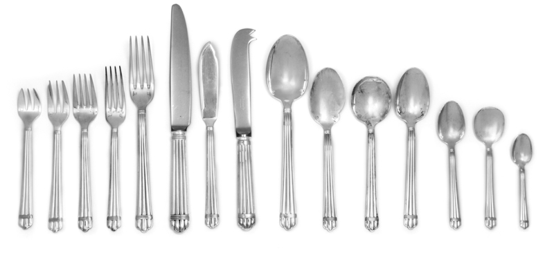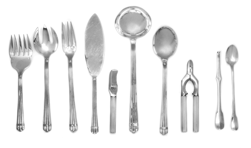 Aria pattern, comprising:11 dinner knives5 salad knives5 butter knives12 fish knives10 dinner forks11 dessert forks12 pastry forks12 oyster forks5 salad forks8 fish forks12 iced teaspoons10 ice cream spoons9 soup spoons12 fish soup spoons3 demitasse spoons5 place spoons13 coffee spoons12 crab pickers1 nut cracker 1 cheese knife1 lemon knife10 miscellaneous serving articles