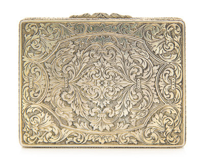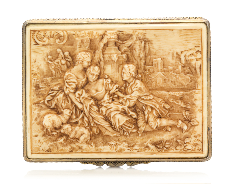 the underside worked to show foliate volute decoration, the composite lid depicting a courting couple in a garden setting.