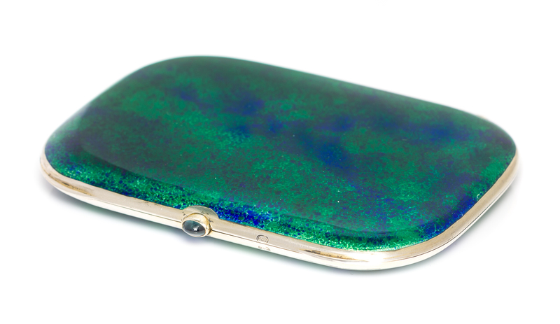 the case having a blue and green paillonne enamel finish.