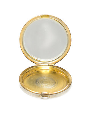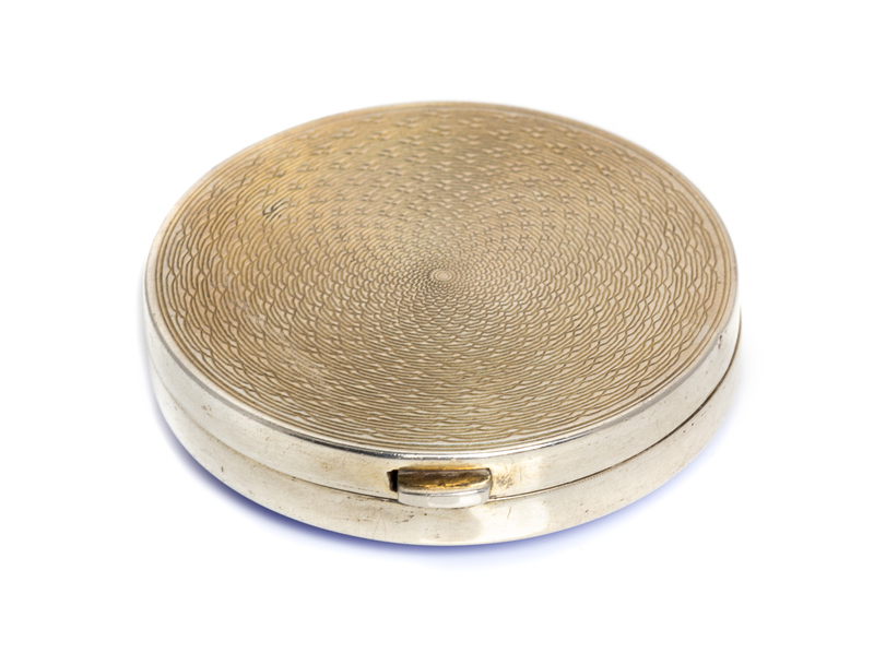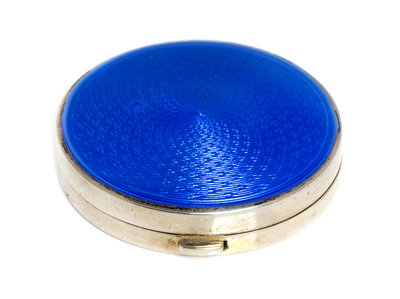 of circular form, the lid with blue guilloche enamel and opening to a mirrored interior, the underside with engine turned decoration.