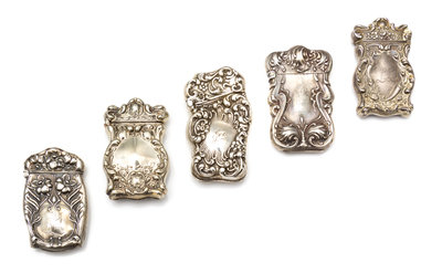 comprising an example by Unger Brothers, Newark, NJ and four without maker's marks, each case worked with floral, foliate and volute motifs.