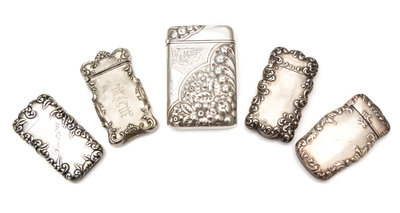 comprising an R. Wallace & Sons, Wallingford, CT example with a volute decorated border, a foliate and C-scroll decorated example and a repousee floral and volute decorated example, together with two similarly decorated silvered metal examples.