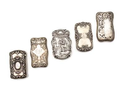 comprising an example by Gorham Mfg. Co., Providence, RI with a foliate volute decorated case; an example worked to show a seated maiden in a garden; an example worked to show C- and foliate scrolls centered by an engraved roundel and a case with a floral decorated border, together with a silvered metal example.