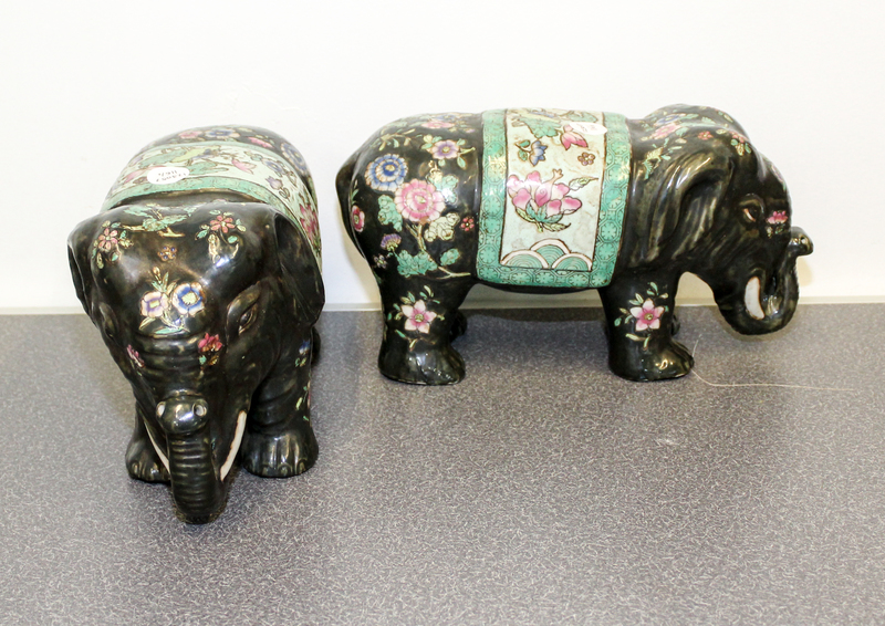 in the form of elephants with polychrome floral decoration.