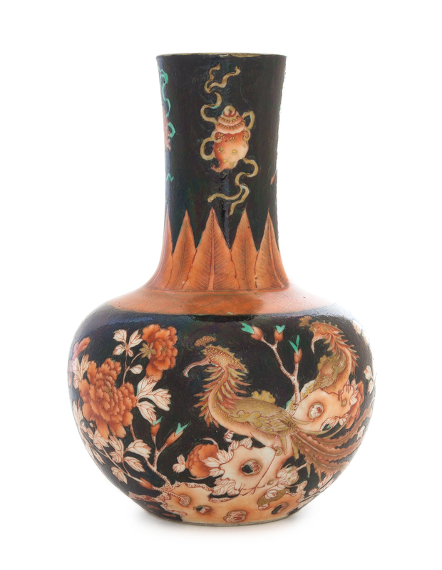 having a spherical body rising to a tall cylindrical neck, painted to show phoenix amongst flowering peonies under a band of plantain leaves below ribbon-tied Buddhist emblems, all against a dark ground, the underside bearing a six-character Qianlong iron red mark.