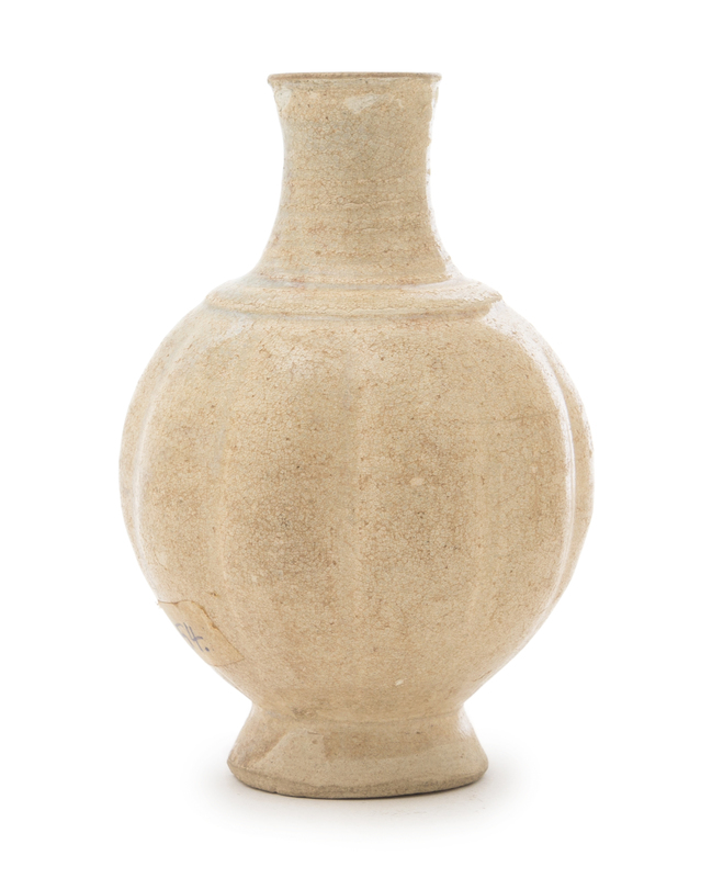 the globular body having lobed outlines, rising from a recessed splaying foot to a tall neck surmounted by a rolled up lip, covered in a creamy glaze.