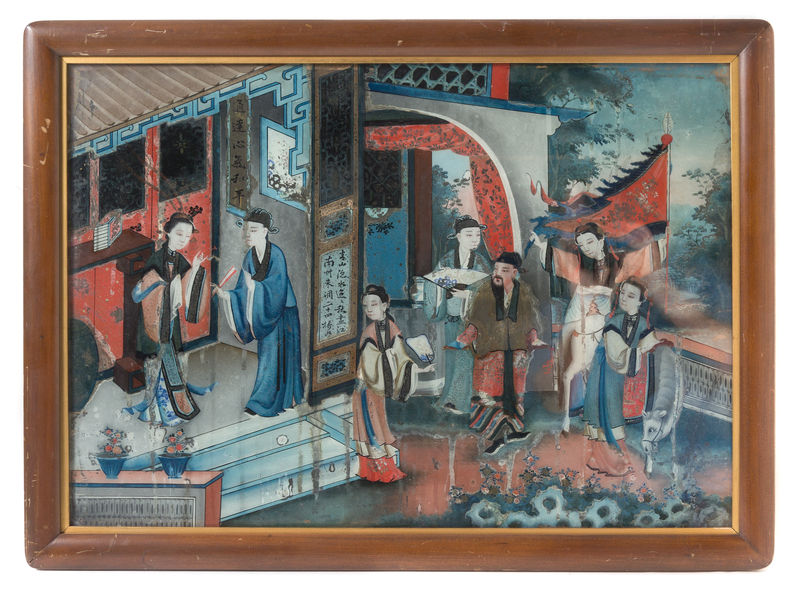 of rectangular form, depicting an interior scene with scholars and maidens in various pursuits, mounted in a hardwood frame.