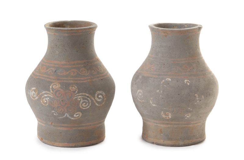 each of pear shape raised on a short straight foot, the main panel painted with floral scrolls in red and white.