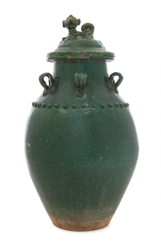 the baluster body decorated with a band of raised bosses and applied with two pairs of double strapped handles, the domed cover surmounted with a fu lion finial.