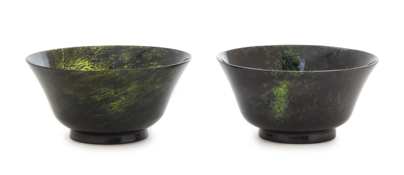 each of a mottled stone with black inclusions, having steep rounded sides raised on a short splayed foot.