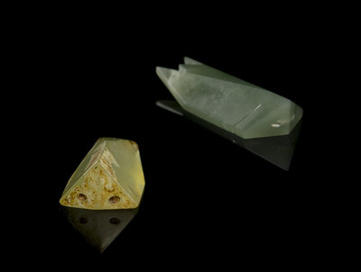 one of an olive green stone, the other of a yellow stone with russet skin, each of a stylized geometric form.