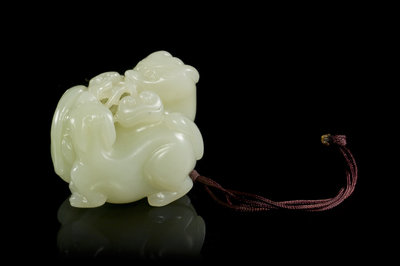 of even colored stone, depicting the qilin clutching at a branch of lingzhi fungus.