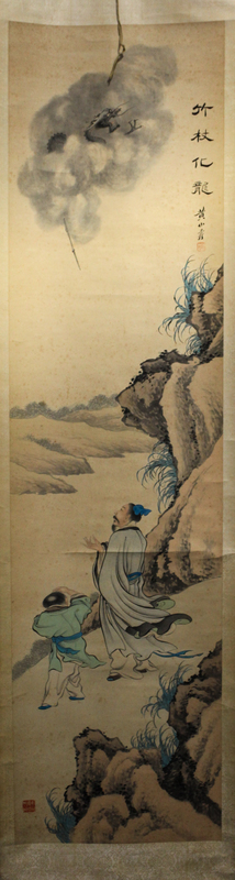 Bamboo Cane Transforming into a Dragon depicting two human figures in a rocky landscape, in the sky a bamboo cane transforming into a dragon within a cloud of smoke