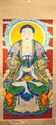 depicting a Buddha seated in dhyanasana atop a lotus plinth, with hands in dyanasanamudra, wearing dragon robes, the face with a benevolent expression, having curly hair and centered by a ushnisha.