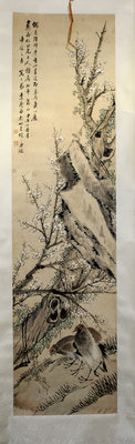 Bird and Flower Painting depicting two quails amid rocks, prunus tree branches, and vines