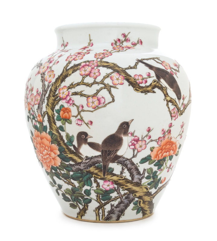 of robust form, the main panel depicting three magpies perched on prunus branches with one in flight, the underside bearing a six-character Guangxu mark in underglaze blue within double rings.