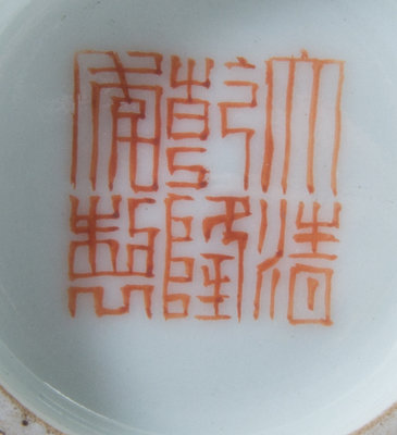raised on a short straight foot and surmounted by a slightly flared and gilt highlighted mouth, the main panel decorated with lotus scrolls alternating suspending bats, all on a bright yellow ground, bearing an apocryphal six-character Qianlong iron red mark to the underside.