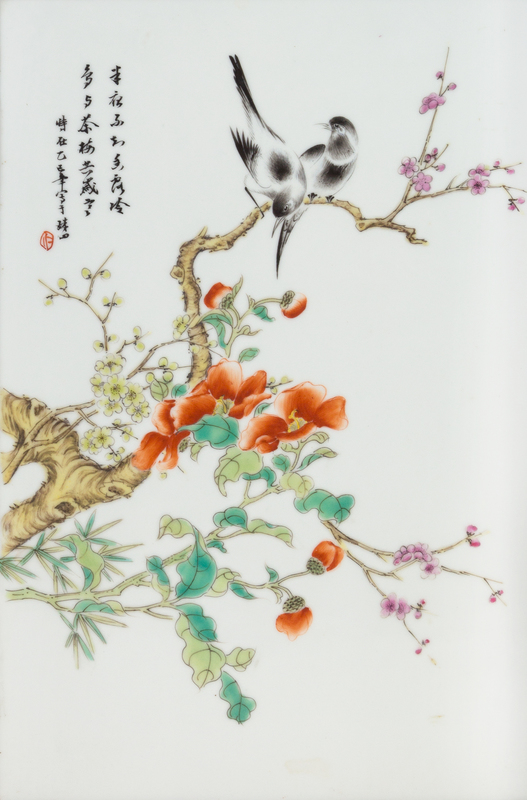 of rectangular form, depicting two magpies perched on flowering branches, having inscriptions in black ink and one red seal to the upper left corner, mounted in a black lacquered frame.