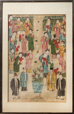 depicting elderly people performing a ceremony in front of a large plant, surrounded by mothers and children, framed.