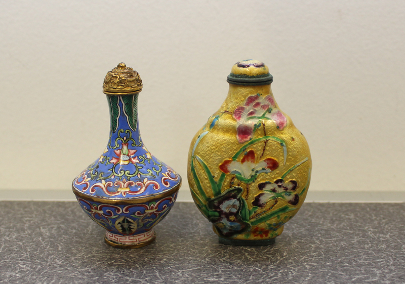 the first of flattened shield form raised on an oval foot, the front and back embellished with painted enamel decoration depicting a bird, flowering branches, rocks and a butterfly on a light yellow ground, with matching stopper, the second of compressed form with a long, slender neck and enamel foliate scroll designs against a purple ground, the circular base bearing a two-character mark in blue enamel, with a gilt bronze stopper featuring a dragon design.