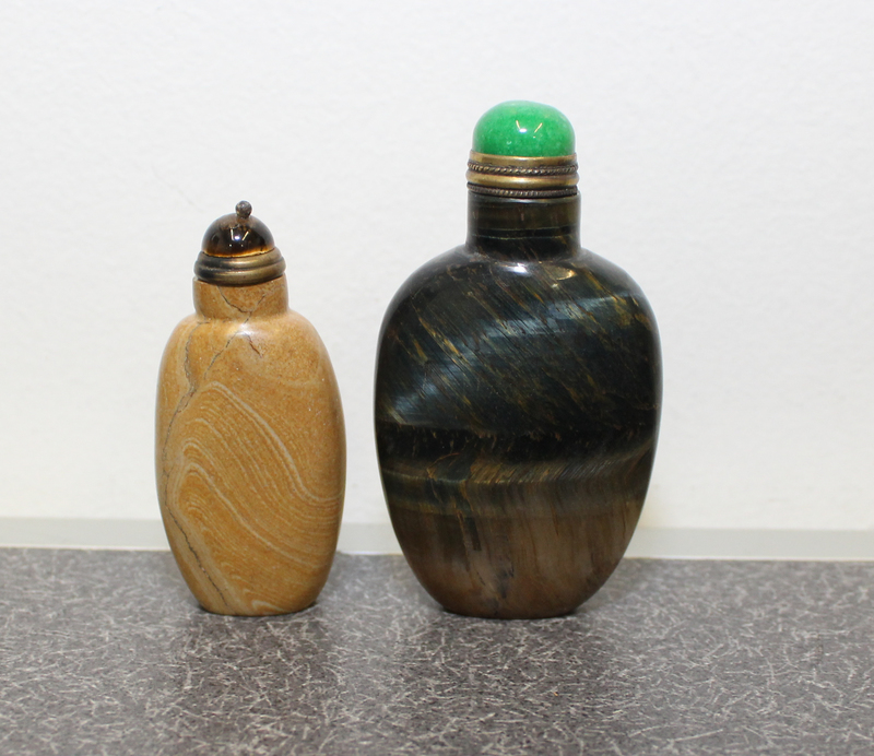 the first of flattened ovoid form, featuring a gradient from deep brown to light brown, with green hardstone stopper, the second of rounded rectangular form and light brown color with wood grain striations, having a cat's eye stopper with small protruding knob.