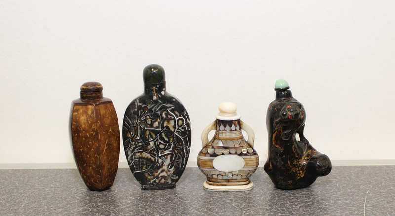the first a mother-of-pearl example of flattened spade form with two applied handles and geometric inlay designs raised on a tiered oval foot, with original stopper, the second a bamboo example of elongated ovoid form with six facets tapering to a circular foot, the third a lacquered wood example in the shape of asymmetrical organic knotted wood, with a carved animal climbing over the shoulder, having a green hardstone stopper, the fourth a hardstone example with mother-of-pearl inlays, of flattened ovoid form on a raised oval foot, the front depicting a scene near a bridge and a fruit tree and a horse with two riders, one of them bearing a double-gourd, the back depicts two riders on a deer, bearing a banner while crossing a stream, with a spinach jade stopper.