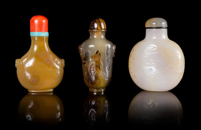 the first of a flattened pear form, decorated with two carved bats on the shoulders, raised on an oval foot, having a coral stopper, the second a carved shadow agate example of flattened circular form, the white body having speckled brown inclusions along one shoulder, the front side decorated with a boy fishing in a lakeside landscape of hills and trees, the reverse a carving of a boy chasing a bird through a wooded scene, the third a baluster form example raised on a circular foot, decorated with a low-relief carving of a fish on one side and a scene of lotus and dragonfly on the reverse, having two carved lion-mask and ring handles, the body of milky white color with yellowish-brown, russet and dark-brown inclusions, with banded agate stopper.