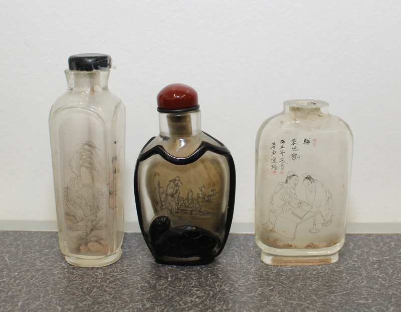 the first of flattened rectangular form, painted to one side depicting two scholars studying a manuscript by candlelight, the reverse with a man and a woman reading the pages of a letter by candlelight, signed Ma Shaoxuan beside the poetic inscription, the second of elongated quadrilateral baluster form, decorated on all four sides with scenes on raised panels, two of the panels depict the immortal Zhong Kui with a bat, the other two panels depict mountainous landscapes painted in grisaille, the third of flattened shield form, carved through black overlay to a clear body with carved turtle decorations on both sides, having another inside painted bottle set within the clear body, decorated with a scene of two musicians on one side and two monks on the reverse.